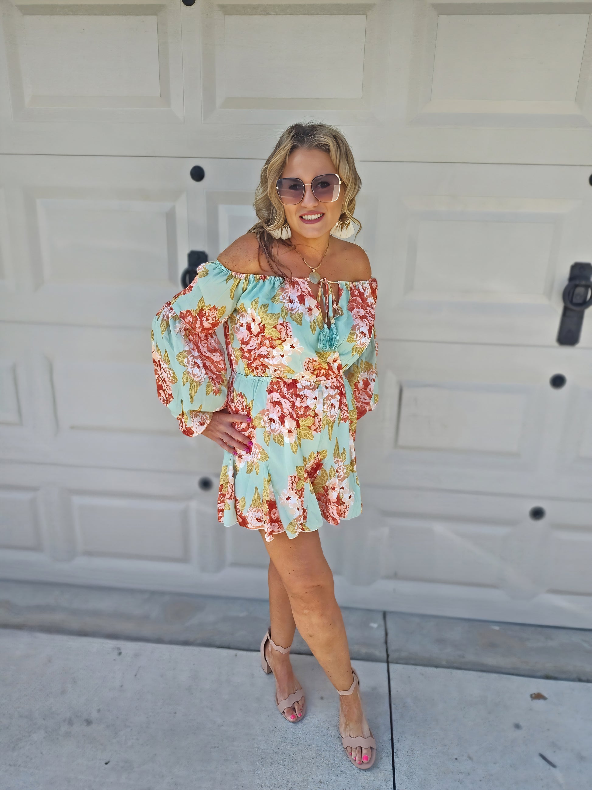 This flowy romper has the off the shoulder look with the ruffles around the bottom hemline. It has a cinched waist band.